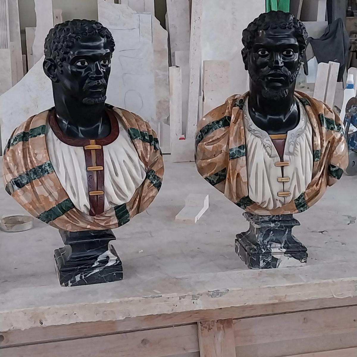 Coppia di Mori Veneziani – Stile Settecentesco Eccellenza artigianale firmata Luigi Bombardieri. Splendida coppia di busti ispirata alla grande tradizione veneziana del XVIII secolo. Queste opere fondono il rigore della scultura classica con un ricercato gusto decorativo, ideali per ambienti di alto prestigio. Materiali Pregiati: Teste finemente scolpite in Nero del Belgio dalla finitura lucida e profonda. Policromia: Vesti realizzate con un sofisticato intarsio di marmi policromi che simulano la preziosità dei tessuti barocchi. Dettagli: Ogni elemento, dalle espressioni fiere ai bottoni dorati, è rifinito interamente a mano. Un’opera che non è solo decorazione, ma un investimento nell’arte lapidea italiana. Per ricevere dettagli sul prezzo, certificato di autenticità e modalità di spedizione, contatta direttamente l'artista, Invia un messaggio privato tramite WhatsApp: +39 333 3000253 Disponibile per visione in studio su appuntamento.