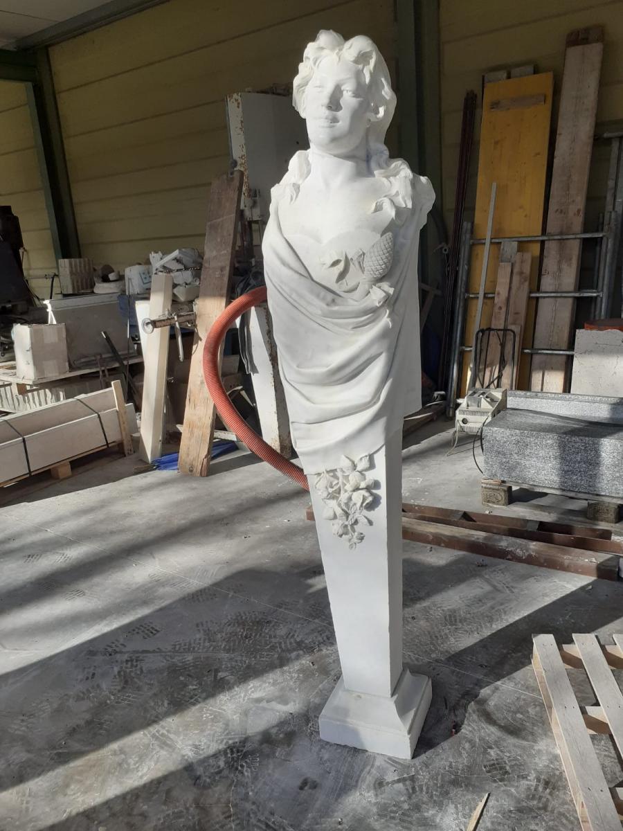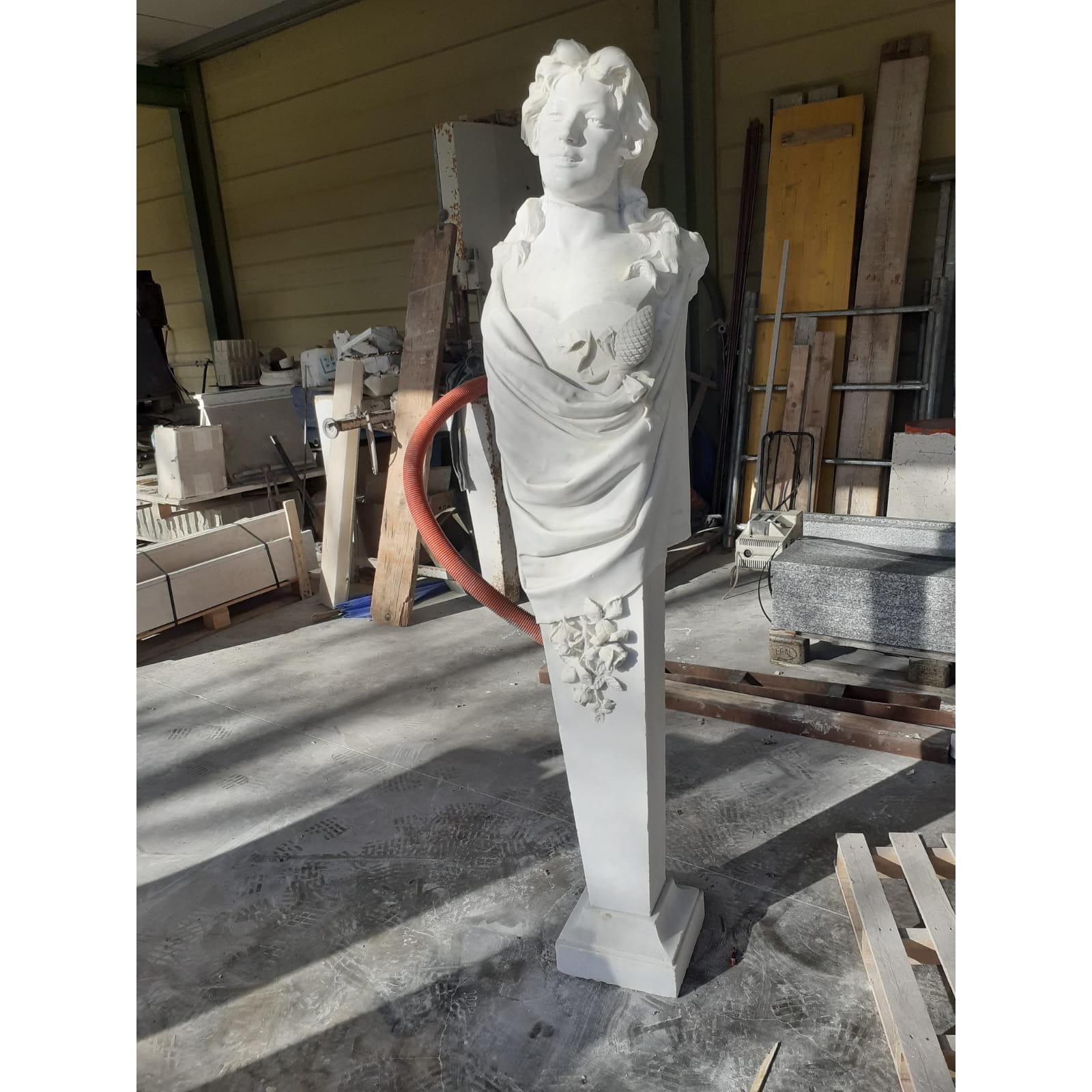 Questa Erma rappresenta una raffinata reinterpretazione della scultura antica, dove il busto della figura si fonde armoniosamente con il pilastro quadrangolare sottostante. Scolpita in un marmo bianco purissimo, l'opera emana una luminosità naturale che mette in risalto la morbidezza del modellato e la precisione dei dettagli decorativi. La figura, dalle fattezze giovanili e lo sguardo rivolto verso l'alto in un'espressione di serena contemplazione, è avvolta in un panneggio fluido che attraversa il petto con naturalezza, conferendo dinamismo alla struttura tipicamente statica del pilastro. Dettagli Artistici: Il Simbolismo Floreale: Sul fronte del pilastro emerge un delicato festone di fiori e foglie scolpito ad alto rilievo, che risale verso la figura. Questo elemento non solo decora la base, ma funge da raccordo visivo tra la rigidità geometrica del supporto e la vitalità del busto superiore. Elementi Iconografici: Sul petto, parzialmente velati dal drappeggio, si distinguono elementi che richiamano la natura e l'abbondanza (come una pigna o un frutto), suggerendo una dedica a divinità boscherecce o allegorie della primavera e della rinascita. Lavorazione: La finitura levigata del marmo esalta la capacità dell'artista di trattare la pietra come fosse materia viva, alternando superfici lisce a dettagli finemente cesellati nei capelli mossi e nelle pieghe della veste. Collocazione Ideale: Per le sue proporzioni slanciate e la nobiltà del materiale, quest'erma è ideale per: Interni di Prestigio: Come elemento focale in un salone classico o in un ingresso monumentale. Giardini d'Inverno o Gallerie: Dove la luce zenitale può giocare con le ombre del panneggio. Contesti Architettonici: Per scandire lo spazio lungo corridoi o porticati, seguendo l'antica tradizione romana e rinascimentale.