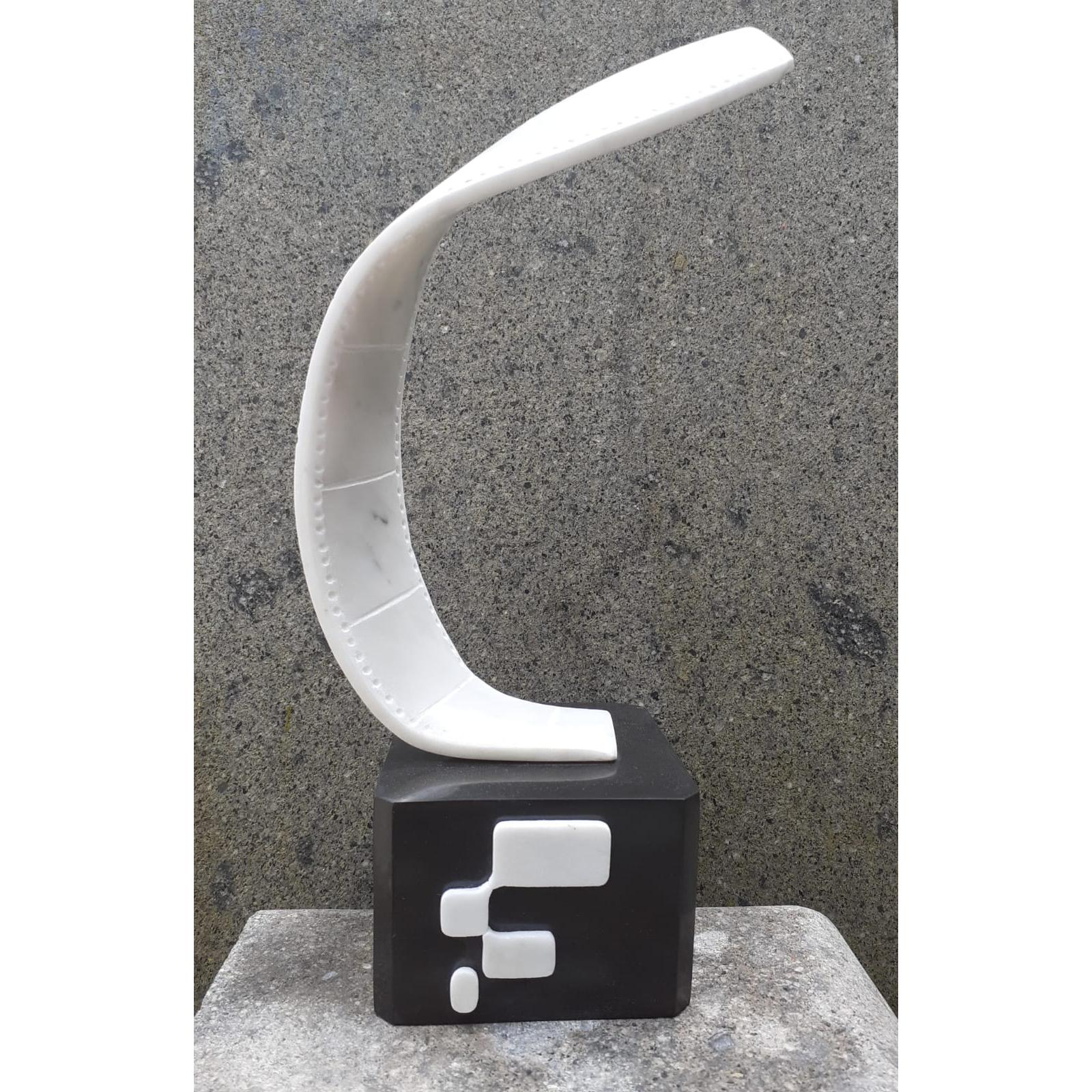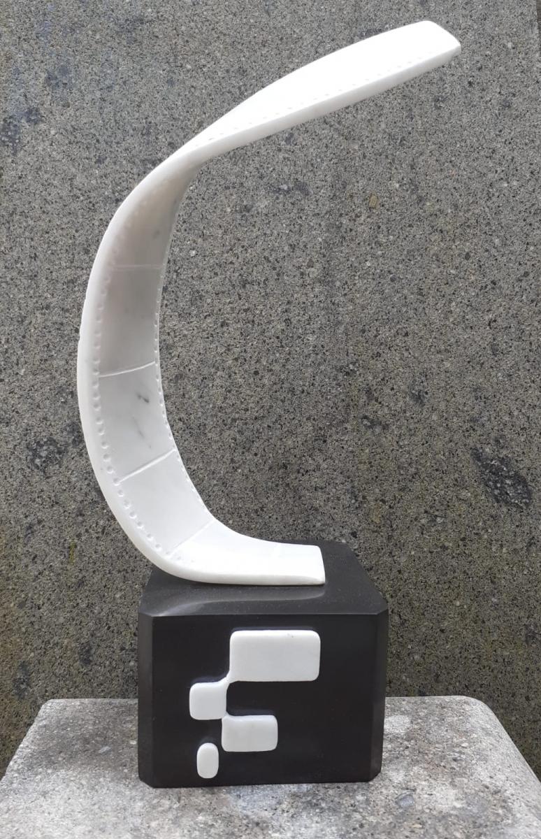 Quest'opera nasce come riconoscimento ufficiale per il concorso di cortometraggi promosso da Forme Web TV, presentato in occasione del 4th Free Aquila Festival presso il Nuovo Cinema Aquila di Roma nel giugno 2023. La scultura interpreta in chiave astratta e dinamica l'elemento simbolo della cinematografia: la pellicola. Realizzata in marmo bianco statuario, la pellicola si flette in una curva sinuosa che sfida la rigidità della pietra, trasmettendo un senso di movimento e leggerezza. I fori di scorrimento laterali, scolpiti con estrema precisione, trasformano il nastro di marmo in un fotogramma tridimensionale che sembra catturare la luce. Dettagli Tecnici e Stilistici: Il Contrasto Cromatico: La struttura bianca poggia su un solido basamento in marmo Nero Belgio, creando un gioco visivo di "chiaroscuro" che rimanda all'estetica del cinema in bianco e nero, tema centrale della rassegna "Mosaico" curata da Forme Web. Design Iconografico: Sul fronte del basamento nero sono incastonati elementi in marmo bianco che riproducono il logo stilizzato dell'organizzazione, unendo l'identità del brand all'eleganza della scultura d'autore. Simbologia: La forma ascendente della pellicola simboleggia la crescita dei giovani talenti emergenti nel panorama cinematografico laziale e nazionale, obiettivo primario della piattaforma Forme Web TV. Storia dell'Evento: Il premio è stato consegnato durante la serata finale del festival al Nuovo Cinema Aquila, un luogo simbolo della cultura cinematografica indipendente nel quartiere Pigneto a Roma. L'opera di Bombardieri è stata scelta per suggellare la collaborazione tra l'arte scultorea e le nuove frontiere della narrazione digitale cross-mediale.