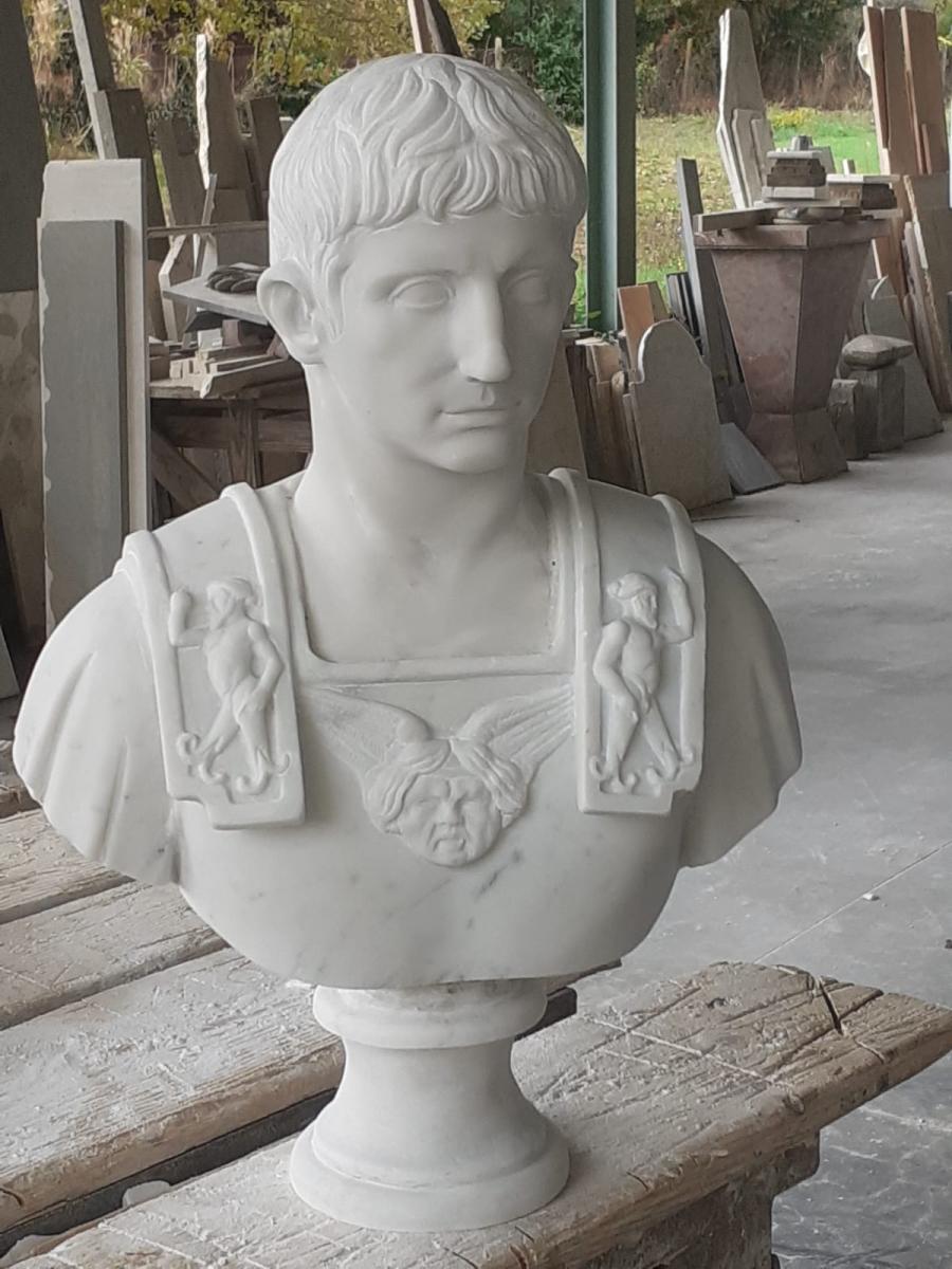 Imperatore Augusto, Autore: Luigi Bombardieri. Materiale: In marmo bianco di carra con bassorilievi sulla corazza. Descrizione dell'opera: In quest'opera, Luigi Bombardieri rende omaggio alla figura di Ottaviano Augusto, il primo imperatore di Roma, icona di pace e restaurazione. Scolpito nel pregiato marmo bianco di Carrara, il busto riprende i canoni del classicismo augusteo, caratterizzati da un'idealizzazione senza tempo e da una solenne compostezza. L'imperatore è ritratto con la tipica acconciatura "a ciuffi", che incornicia un volto dai lineamenti fermi e dallo sguardo lungimirante. La purezza del marmo di Carrara accentua la luminosità della pelle e la nobiltà del soggetto, conferendo all'opera un'aura di eterna giovinezza. Dettagli Artistici e Simbologia: Il vero fulcro dell'opera risiede nella corazza (lorica), dove Bombardieri dimostra una straordinaria maestria nell'esecuzione dei bassorilievi: L'Iconografia Centrale: Al centro del petto campeggia una Gorgone (Gorgoneion) alata, simbolo apotropaico di protezione e forza divina, scolpita con una precisione che ne esalta l'espressività severa. Le Decorazioni Laterali: Sugli spallacci della corazza si stagliano figure mitologiche in rilievo che richiamano il potere e l'ordine dell'Impero, tipiche dell'arte ufficiale romana. Panneggio e Finitura: Le pieghe della veste che spuntano sotto la corazza sono trattate con un realismo morbido, creando un elegante contrasto con la rigidità formale dell'armatura. Note Tecniche: Con un'altezza di 50 cm, questo busto rappresenta un pezzo di notevole importanza plastica. La scelta del marmo bianco di Carrara non è solo estetica ma filologica, richiamando le cave predilette dalla Roma imperiale per i monumenti più prestigiosi. Questa scultura è perfetta per un posizionamento d'onore, capace di trasformare un ambiente privato in una piccola "galleria dei Cesari" contemporanea. Per ricevere dettagli sul prezzo, certificato di autenticità e modalità di spedizione, contatta direttamente l'artista, Invia un messaggio privato tramite WhatsApp: +39 333 3000253 Disponibile per visione in studio su appuntamento.